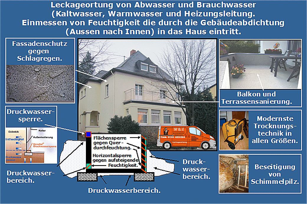 Die Firma W&E hat es sich zur Aufgabe gemacht, mit einem Minimum an Kosten defekte Rohrleitungen, sowie Feuchteschäden rund ums Gebäude zu orten und die Lecktagestelle bzw. die